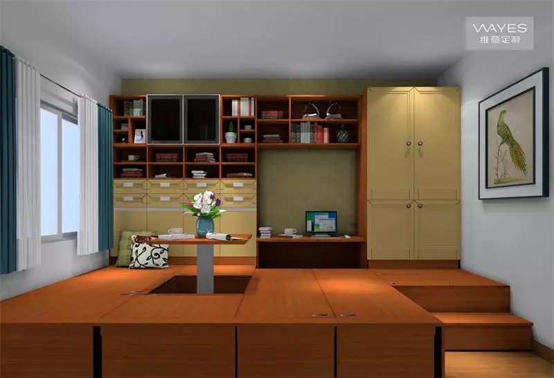 書桌旁邊還可以沿著窗戶做一排榻榻米,兼顧休憩和收納作用。